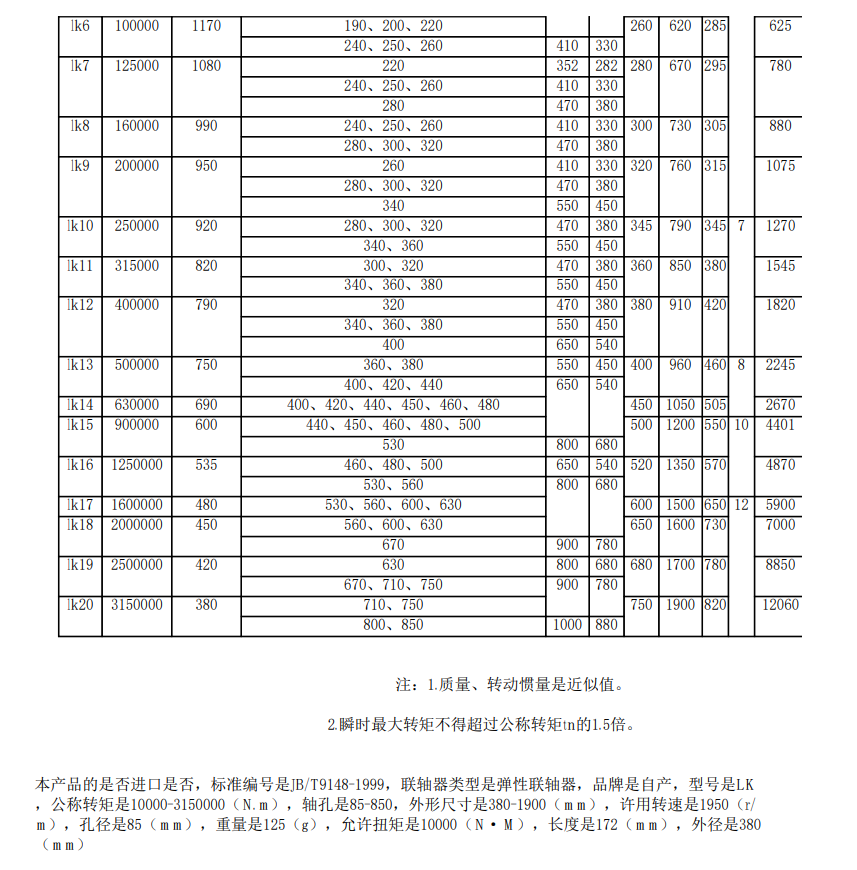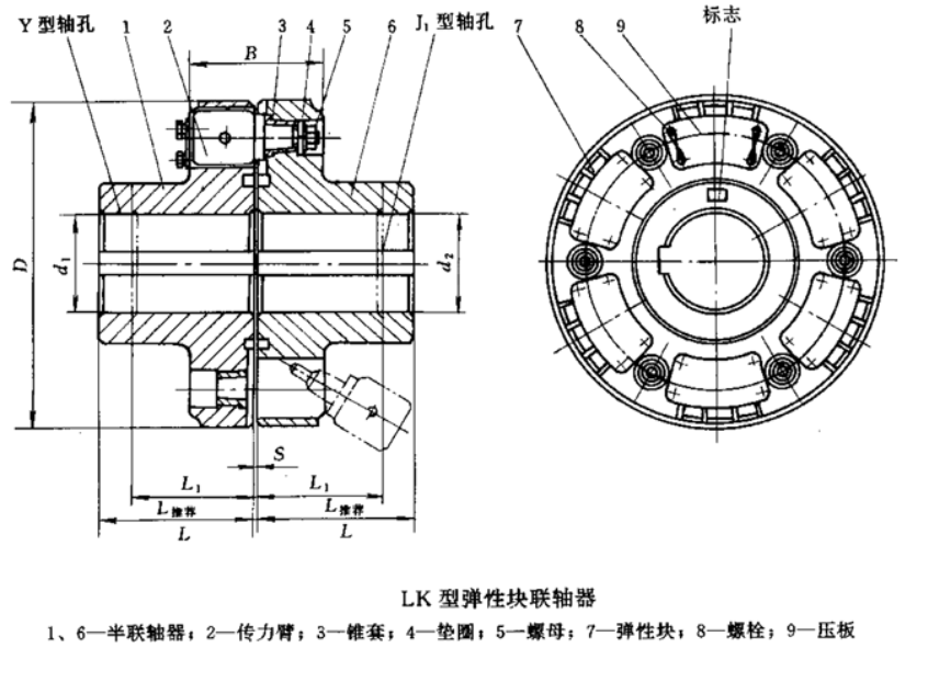 LK彈性塊聯(lián)軸器是以橡膠為彈性元件材料,無扭轉傳動間隙,易于現(xiàn)場調節(jié)剛度的彈性聯(lián)軸器,具有補償兩軸相對偏移以及減振、緩沖性能,節(jié)能,無噪聲,不用潤滑,更換彈性件(易損件)時主機半聯(lián)軸器用作軸線移動(對于重型機械設備此特點尤為重要)。 安裝維護簡便,使用壽命較長,根據(jù)需要通過改變橡膠配方(主要改變硬度)可以調整聯(lián)軸器的扭轉剛度。適用于聯(lián)接兩同軸線大中功率、振動沖擊較大的軸系傳動,例如冶金機械、礦山機械等。原來的標準(ZBJ19029-90)存在外徑尺寸大、質量大等缺點,改進后的新標準(JB/T9148-99代替ZBJ19029-90)新結構不僅保留了減振、緩沖性能好的特點,而且縮小了外徑尺寸,減輕了質量和轉動慣量,提高了許用轉速,經過幾年的工業(yè)應用,優(yōu)點十分明顯,已成原結構的更新?lián)Q代產品。新標準許用轉速平均提高28%,**外徑平均縮小36%,轉動慣量平均減小70%,質量平均減輕57%。